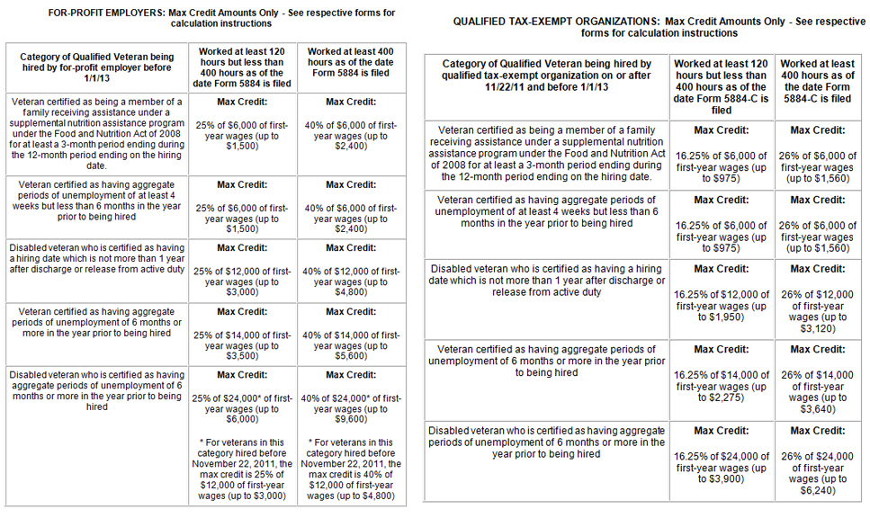 If the veteran has service-related disabilities, you may be eligible for the maximum credit. If you are a tax-exempt organization, the credit that you receive cannot exceed the organization's employer social security tax for the period you are claiming the credit.